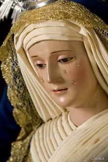 Es una talla de candelero en madera con rostro y manos policromadas. En su rostro observamos cejas rectas y levemente arqueadas hacia las sienes y ojos de color castaño, con pestañas del mismo tono. Nariz recta, boca ligeramente entreabierta y cinco lágrimas de cristal que surcan sobre sus mejillas de color agradablemente sonrosadas. Destacar en su rostro, su ingenua y delicada belleza, así como sus dulces rasgos, que logran aunar al mismo tiempo el sufrimiento y la ternura, el dolor y la divinidad, con la gracia más singular.
