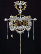 Históricamente perteneció como bandera sumamente significativa al antiguo Imperio Romano. Era, en efecto, el Senatus, la insignia que las legiones paseaban, con acento de victoria, por todo el mundo. Era la bandera del poder. El Imperio Romano hacía con ella ostentación de su poderío, y esas letras S.P.Q.R. se grababan con orgullo en los edificios públicos y a veces en los mismos templos.